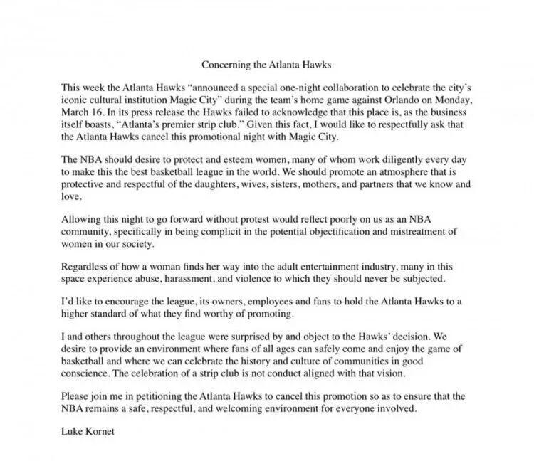 今天,马刺球员科内特在他的社交媒体呼吁,让老鹰取消他们刚宣布的主题日“魔术之夜”活动,称该活动对女性不尊重,因为Magic City是当地一家服务名流的脱衣舞俱乐部。